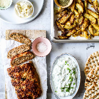 Menu: Græsk farsbrød med stegte kartofler, tzatziki, græsk salat og gnavegrønt